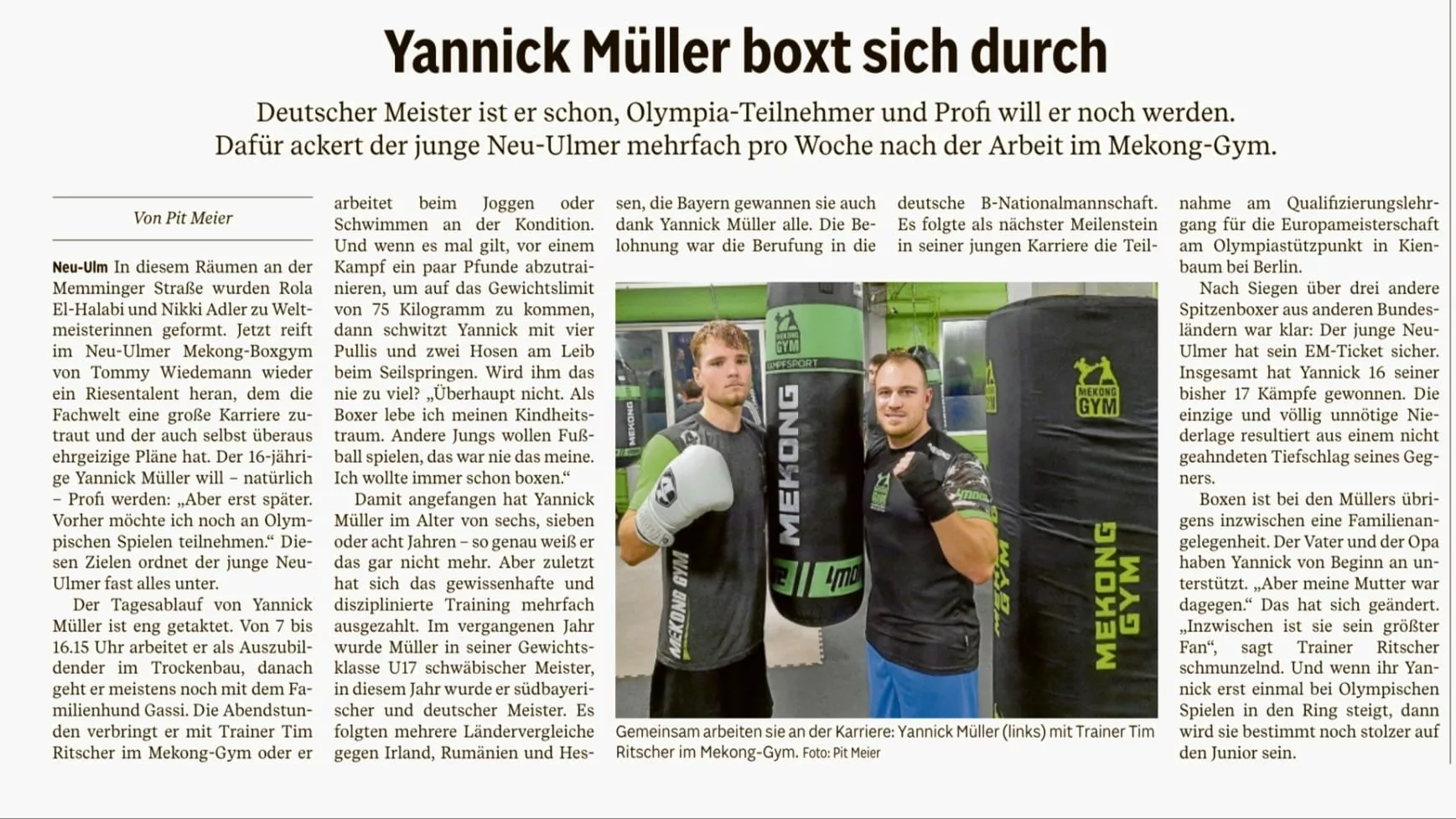 Der Artikel der Augsburger Allgemeinen mit dem Titel „Boxen: Yannick Müller boxt sich durch“ zeichnet das Porträt eines jungen Mannes, der seinen Weg mit beeindruckender Konsequenz geht. Deutscher Meister in der U17, südbayerischer Meister und eine Kampfbilanz von 16 Siegen in 17 Kämpfen – diese Erfolge sprechen für sich. Yannick hat sich damit einen Platz in der deutschen B-Nationalmannschaft erkämpft und sein Ticket für die Europameisterschaft gelöst. Es ist der Lohn für jahrelanges, hartes Training, das bereits im Kindesalter begann.